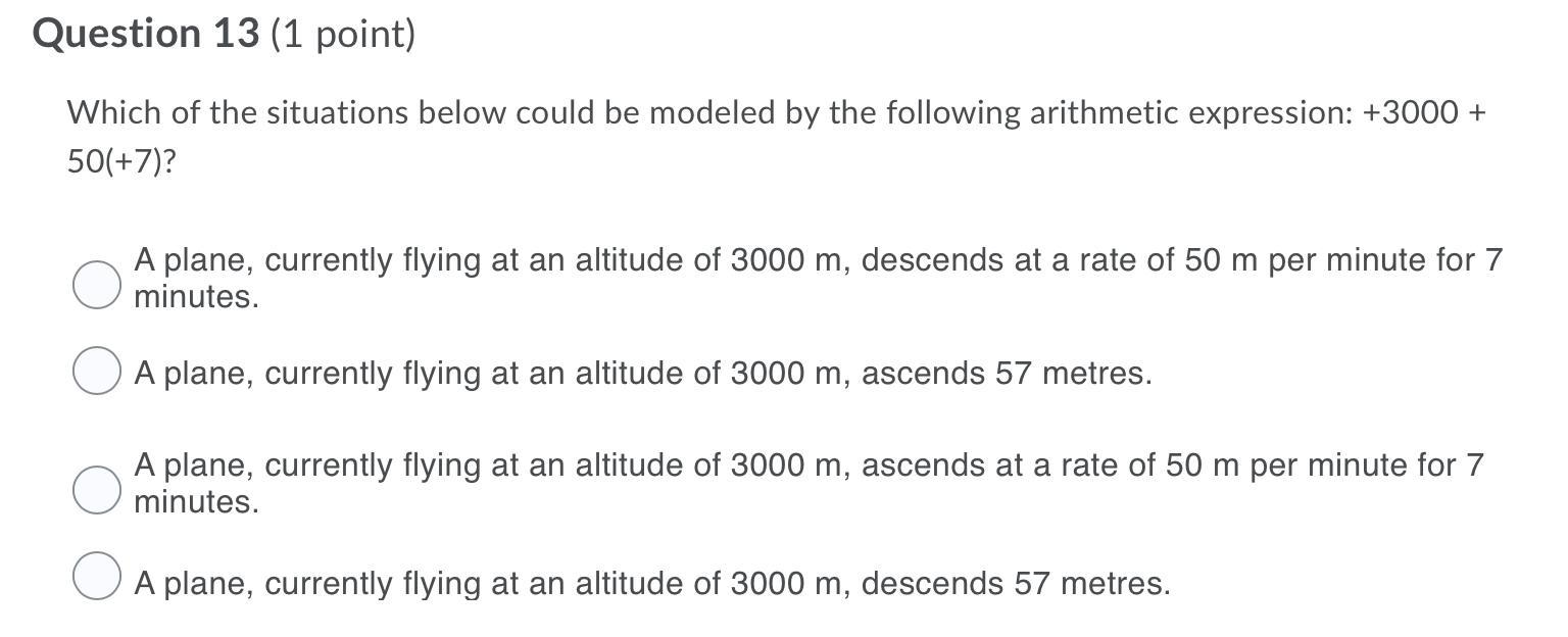 C. A plane, currently flying at an altitude of 3000 m, ascends at a rate of 50 m per minute for 7 minutes.