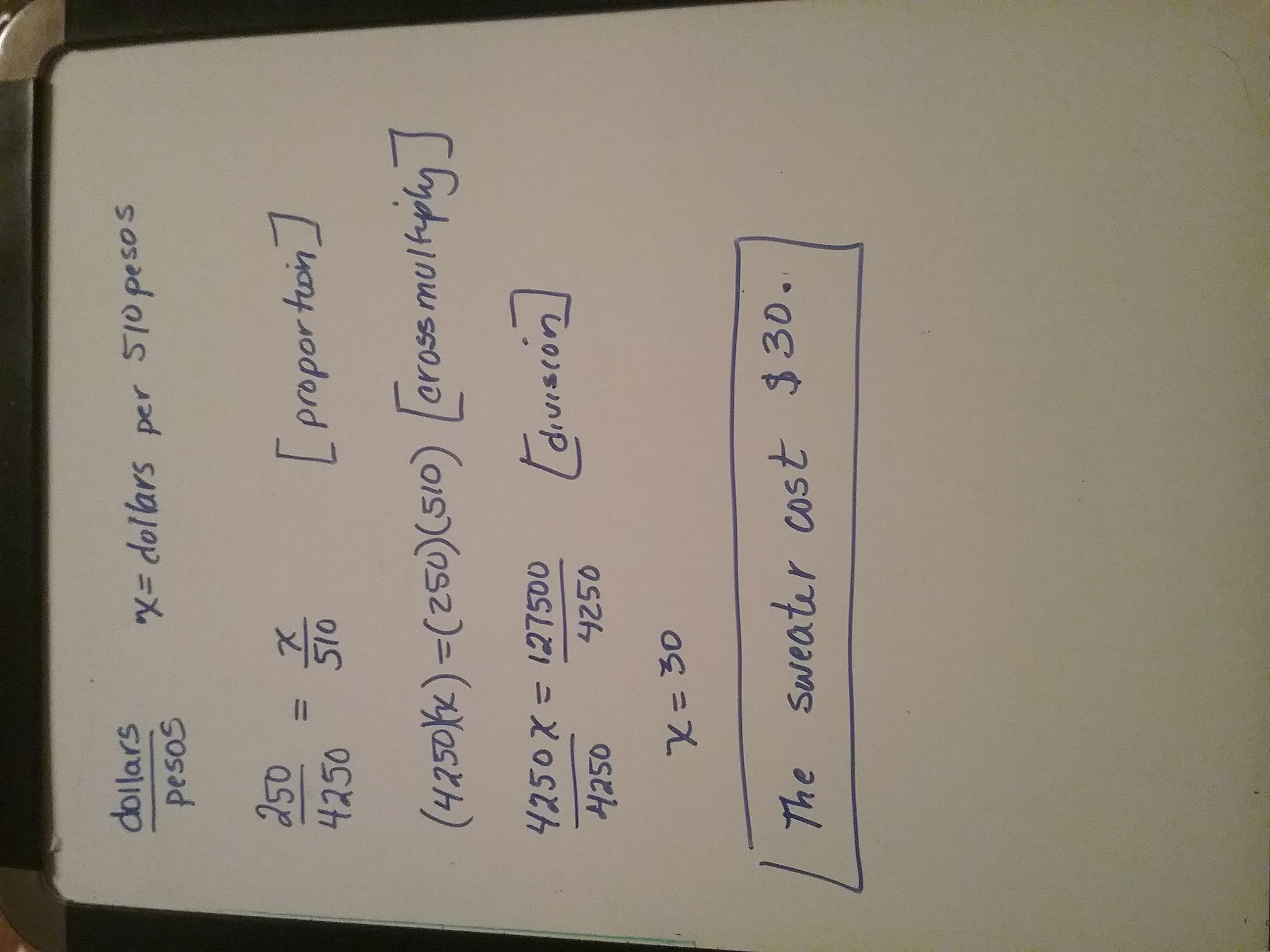 It says priya's family exchanged 250 dollars for 4,250 pesos. Riya bought a sweater for 510 pesos. how many did the sweater cost?