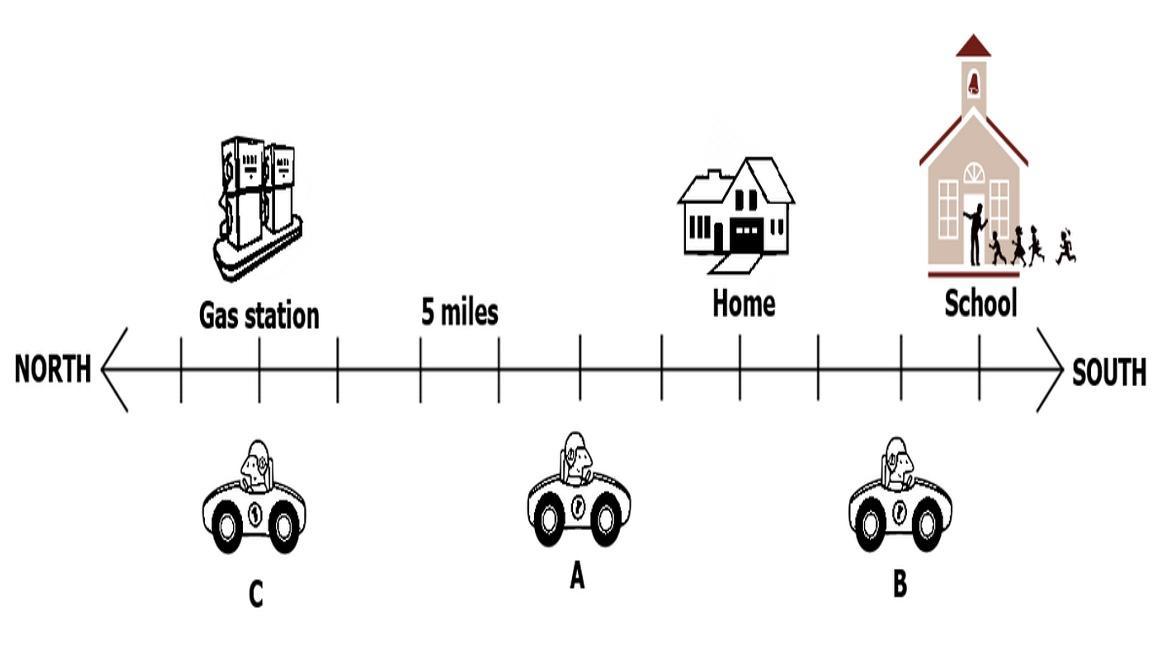 1- Considering that your home is the reference point, what is the location of each of the cars A, B, and C?