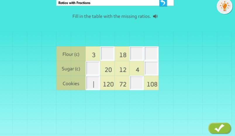If you look up and down, there are one or two boxes missing except for the middle one. The middle one has 18 flour, 12 sugar, and 72 cookies. so for 72 cookies, it contains 18 flour and 12 sugar. so 18:12 is in 72 cookies. if we want to find out how many are in 3 flour, we have to get 18 to 3. so we do /6=3. so we divide everything in that 72 equation by 6. 18/6=3. 12/6=2. 72/6=12.