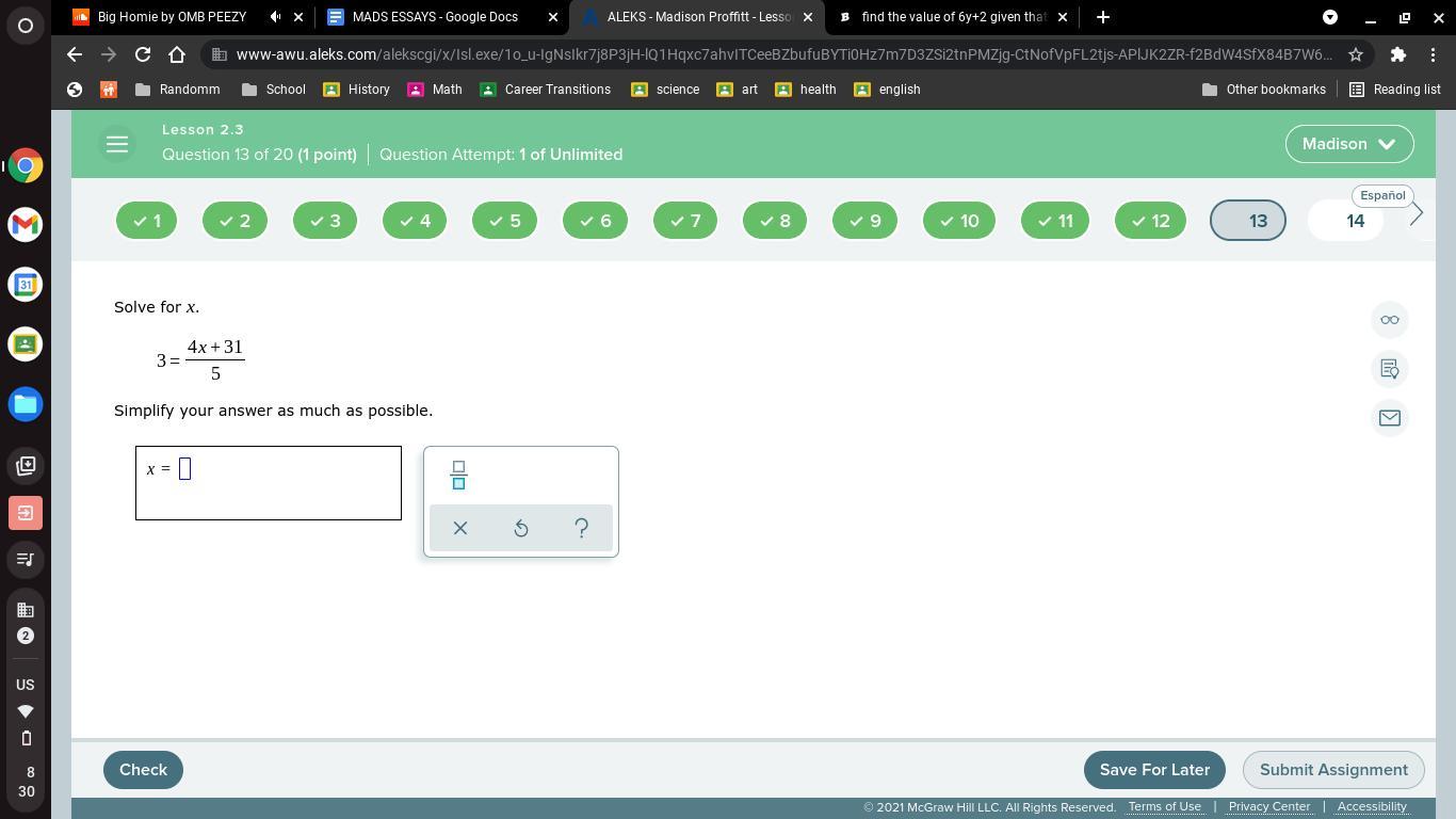 3 = (4x + 31) / 5