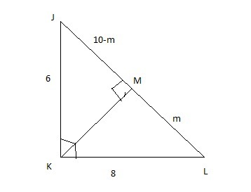 In the given information, triangle JKL with right angle at K. Segment JK is 6 and segment KL is 8. Point M is on segment JL and angles KMJ and KML are right angles.