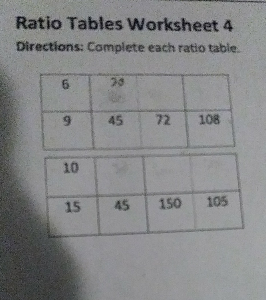 Ratio tables are like proportional relationships (if you know what that is), and you have to do this: 6:9 is related to a:45 we don't know a, but since the prior ratio is related to this one, you simply take 9 times what is 45. The answer is 5, so then you multiply 6 times 5 to get 30. Then keep building off of that. The next problem will be 48, then 72. The bottom ratios start with 10:15. 15 times 3 is 45 so 10 times 3 is 30. The next one is 100, then 70. Hope this helps, sorry that it's confusing!