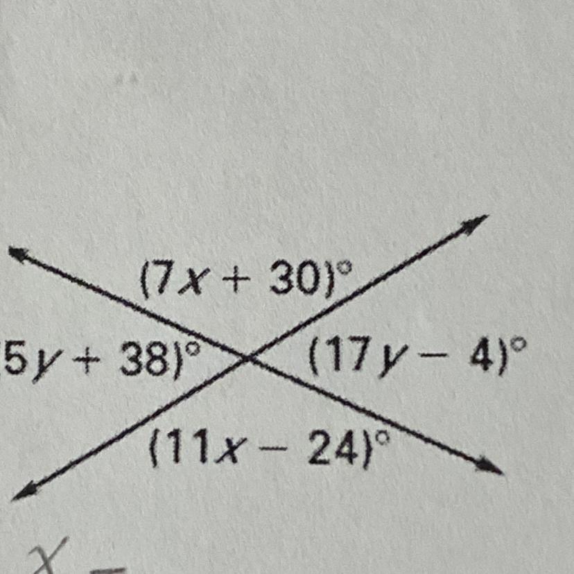 We know that 7x + 30 and 11x - 24 are vertical angles. Therefore, they are congruent/equal to each other.