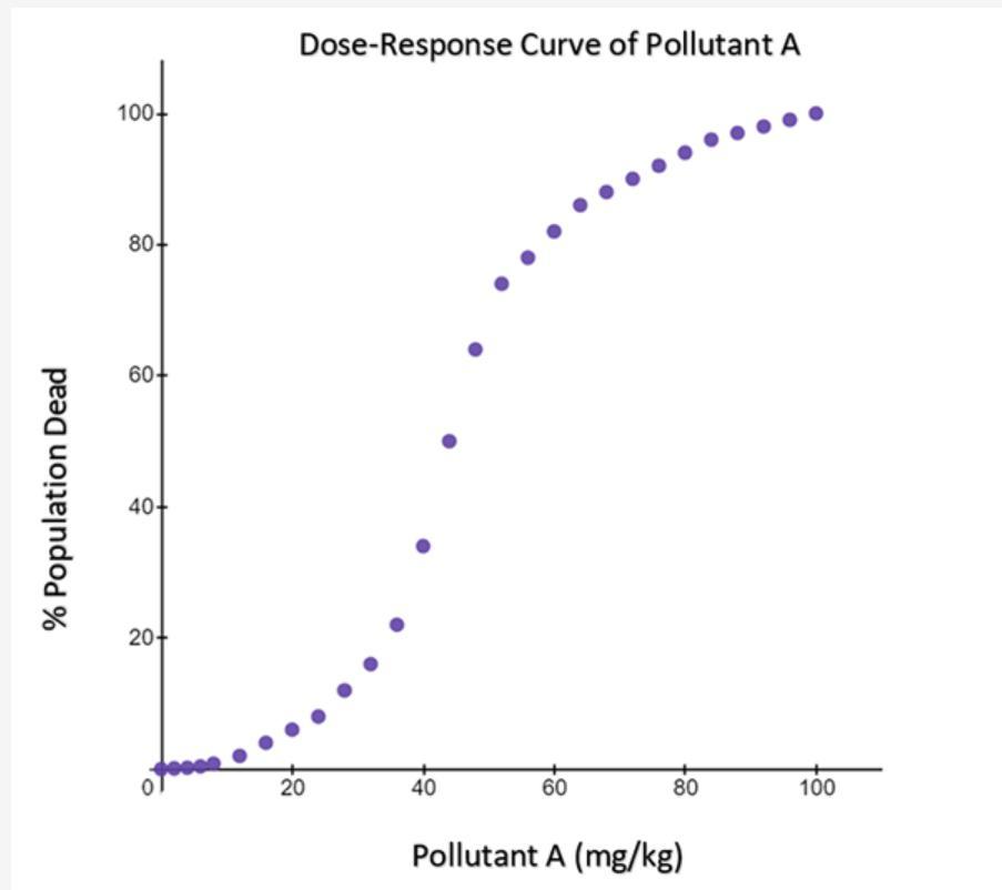 percent of the population died when exposed to thirty-eight milligrams of pollutant A per kilogram of water. Forty percent of the population died when exposed to forty-two milligrams of pollutant A per kilogram of water. Sixty percent of the population died when exposed to fifty-five milligrams of pollutant A per kilogram of water. Eighty percent of the population died when exposed to sixty milligrams of pollutant A per kilogram of water. One hundred percent of the population died when exposed to one hundred milligrams of pollutant A per kilogram of water. Between 0 and 20 mg/kg