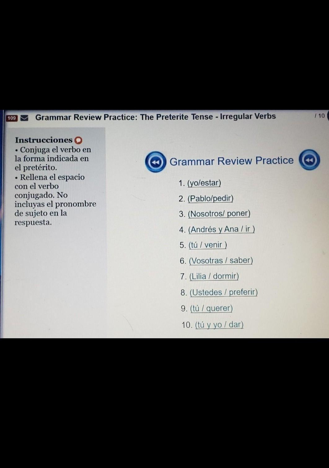 Please hurry). Instrucciones: • Conjuga el verbo en la forma indicada en el preterito. • Rellena el espacio con el verbo conjuga