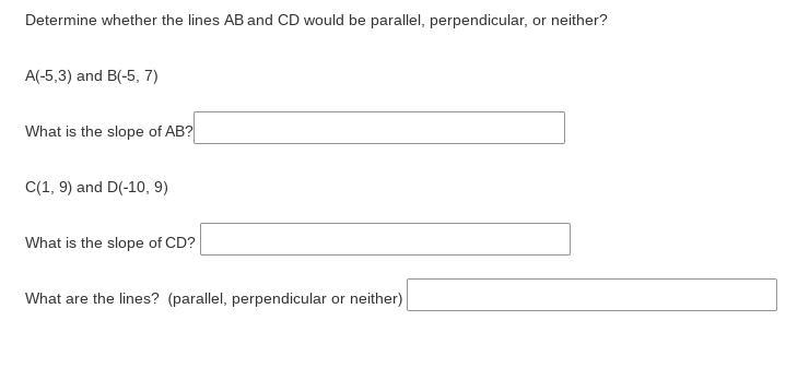 The slope of AB is undefined; the slope of CD is 0; The lines are perpendicular.