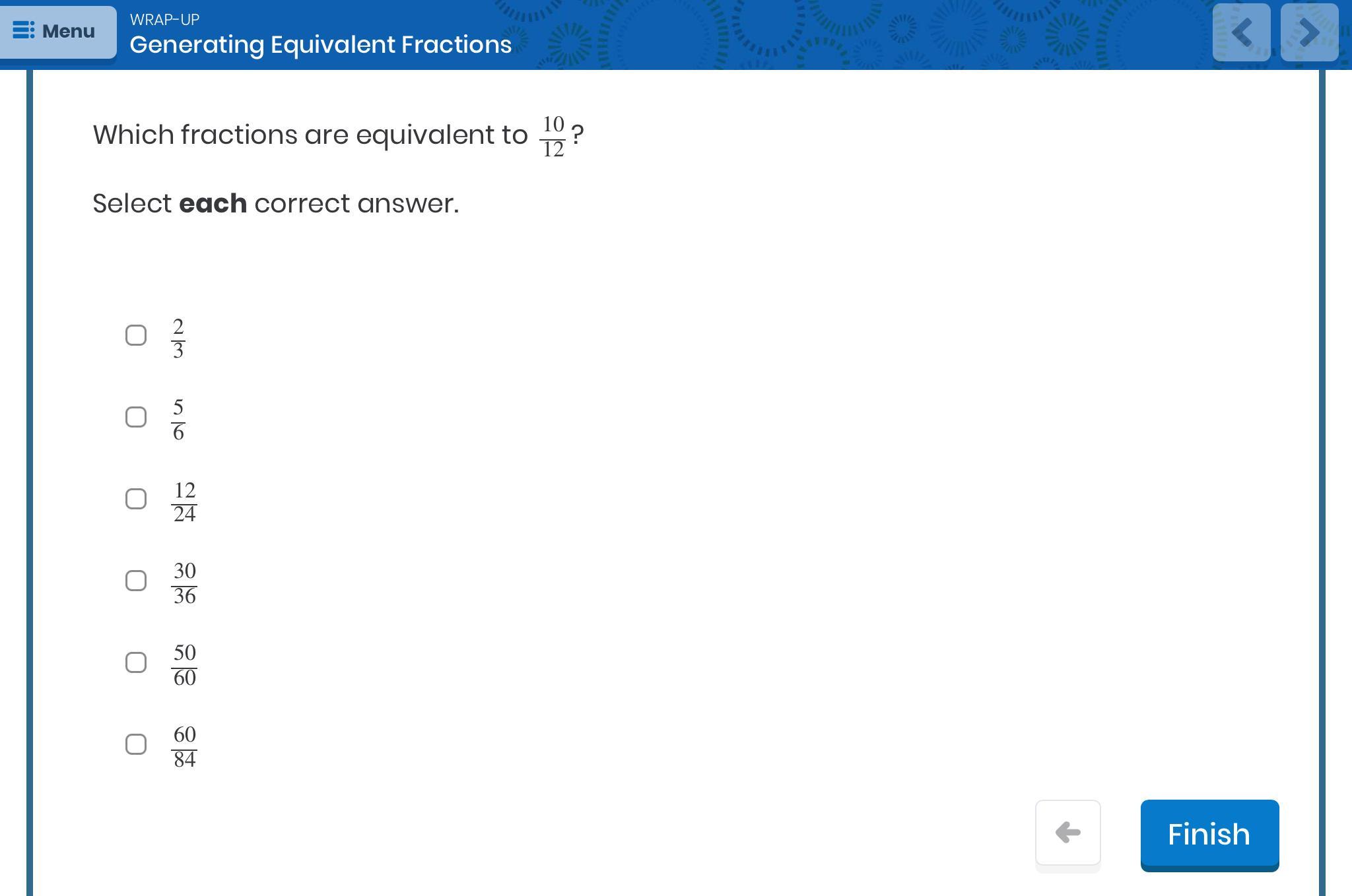 5/6 × 2/2 = (5×2) / (6×2) = 10/12