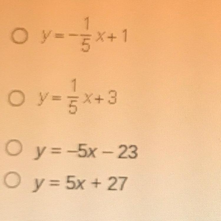 Next, we plug in our values so that we get (-1-2)/(10-(-5)). This will then lead us with -3/15 which simplifies to -1/5. This is our slope. Now that we have our slope we can rule out every option except the first for the answer. However, if we want to look for the entire answer we need to plug in one of our given values in the formula we have: y=-1/5x.