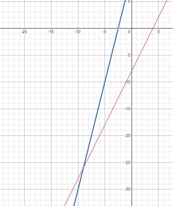 The answer to these equations is (-9, - 26). If you graph this, this is the point where the two graphs intersect.