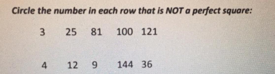 This rules out everything but 12 in the second row. You can determine what is a perfect square through trial and error, or by memorizing what the perfect square numbers look like. With enough practice, they should be fairly memorized by some point.
