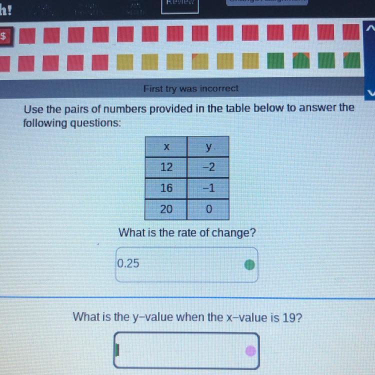 If the rate of change is 0.25, then every time the x-value goes up by 1, 0.25 will be added to our y-value. For example, if we were to go from the x-value of 12 to 13, then our y-value would be -1.75.