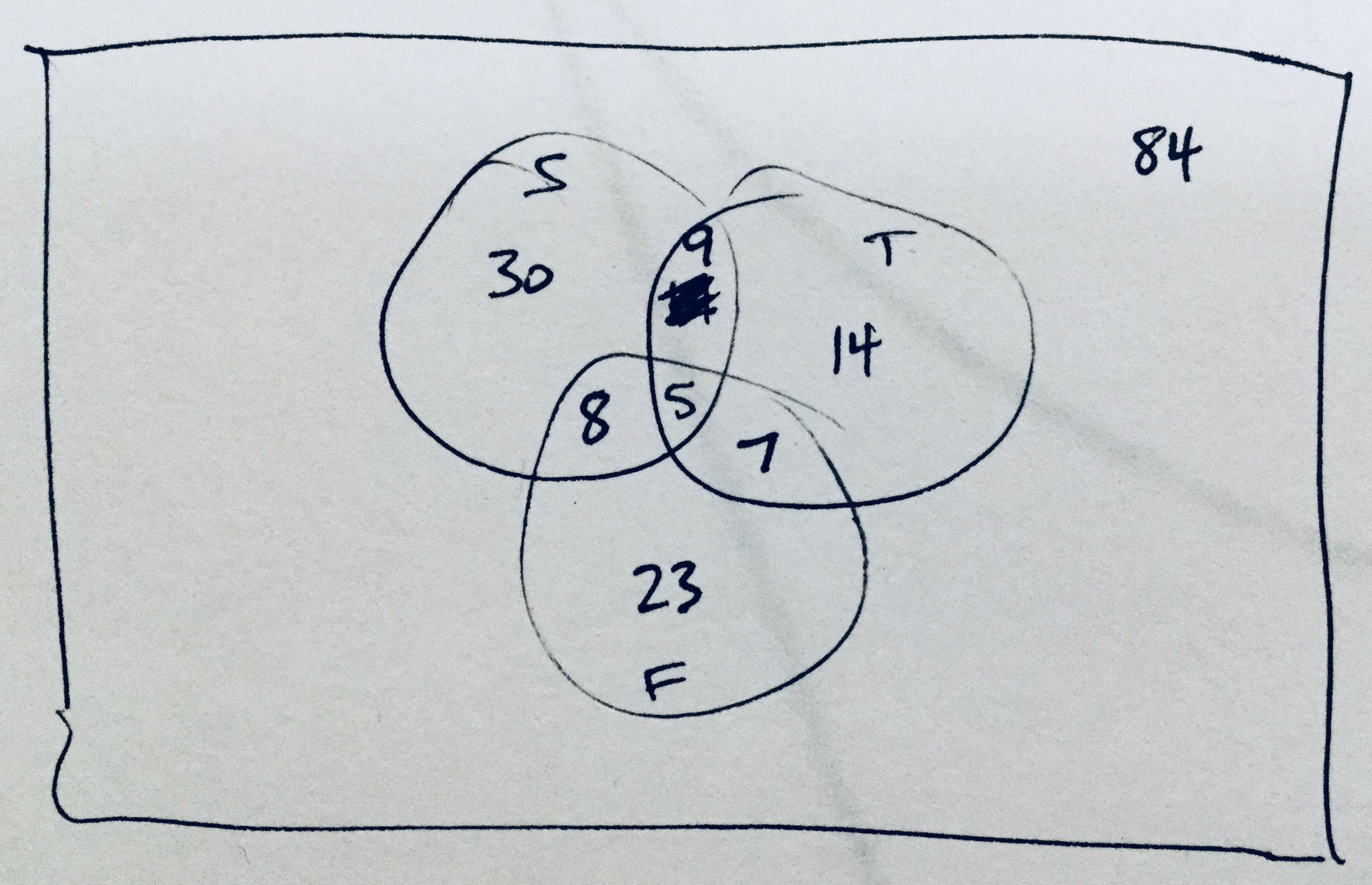 It usually works best to draw the Venn diagram from the inside out, starting with the number in all three categories.