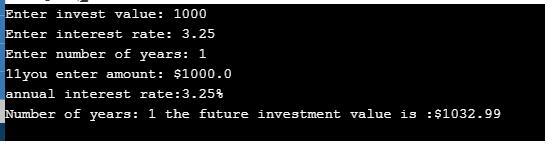 System.out.printf("Number of years: "+years+" the future investment value is :$%.2f\n",future_investment_value);//print calculated value