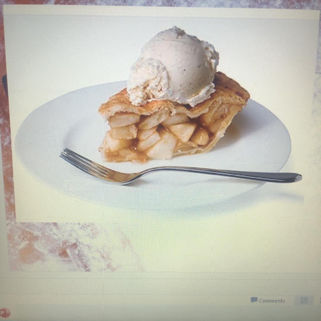 The crust of this delectable morsel, is a golden, crisp-brown color, and atop is a perfect scoop of vanilla ice cream. Its insides contain chopped apples/pears, that mingle together in a sweet, syrupy mixture, comprised of more apples/pears.