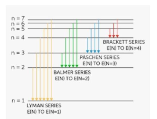 nstruct a step-by-step written description of what is happening at the atomic level. Make sure to label the axis, energy levels, and cause of the electron transition.