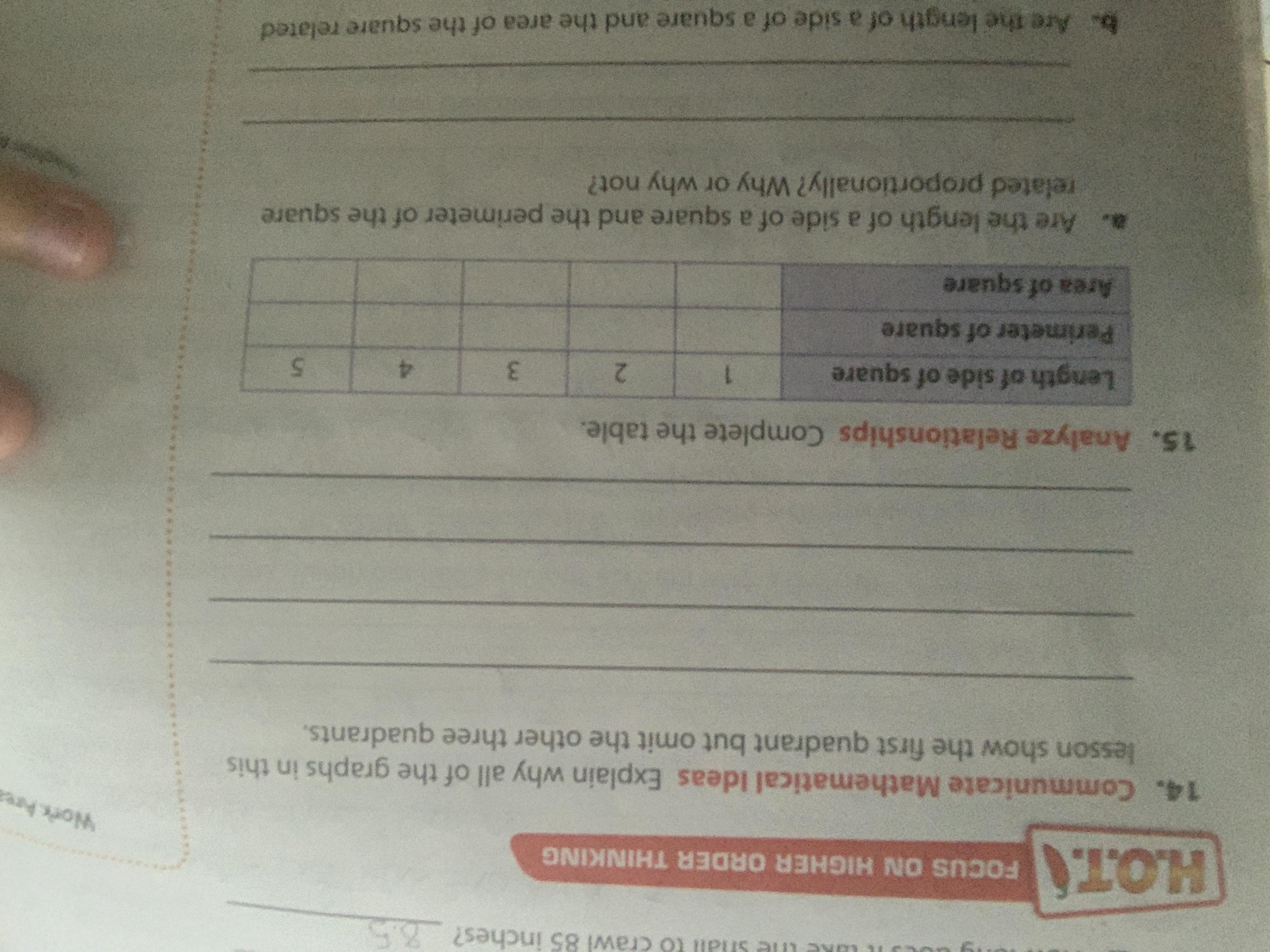 b. Are the length of a side of a square and the area of the square related proportionally? Why or why not?