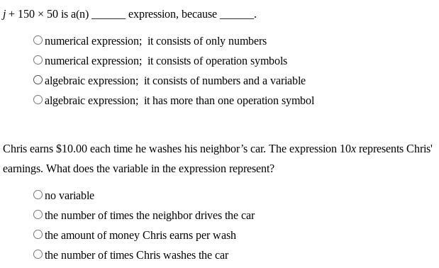 <u>Algebraic Expression:</u> Contains numbers, operations, and <u>variables</u>. They are the same as normal, numerical expressions with the exception that it also has letters, or variables.