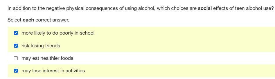 In addition to the negative physical consequences of using alcohol, which choices are social effects of teen alcohol use? Select each correct answer O may eat healthier foods O may lose interest in activitiosung 2 more likely to do poorly in school risk losing friends T8 9 10