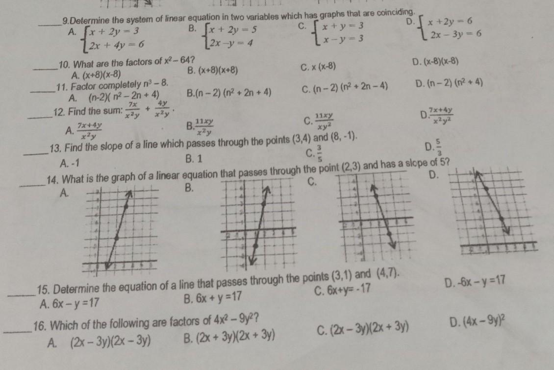15. The line will have the form of y=mx+b. Calculate m, the slope, from the two points (3,1) and (4,7). Rise = 6, Run = 1 Slope = 6. y=6x+b. Find b by using either of the given poins and solving for b. I'll choose (3,1). y=6x+b; 1 = 18 + b; b = -17. The equation is y=6x-17. Rearrange option A (y =6x - 17).