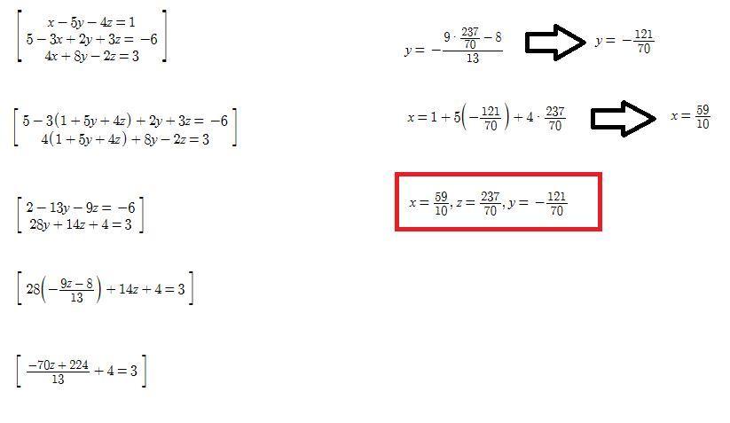 x = 59/10, z = 237/70, and y = -121/70