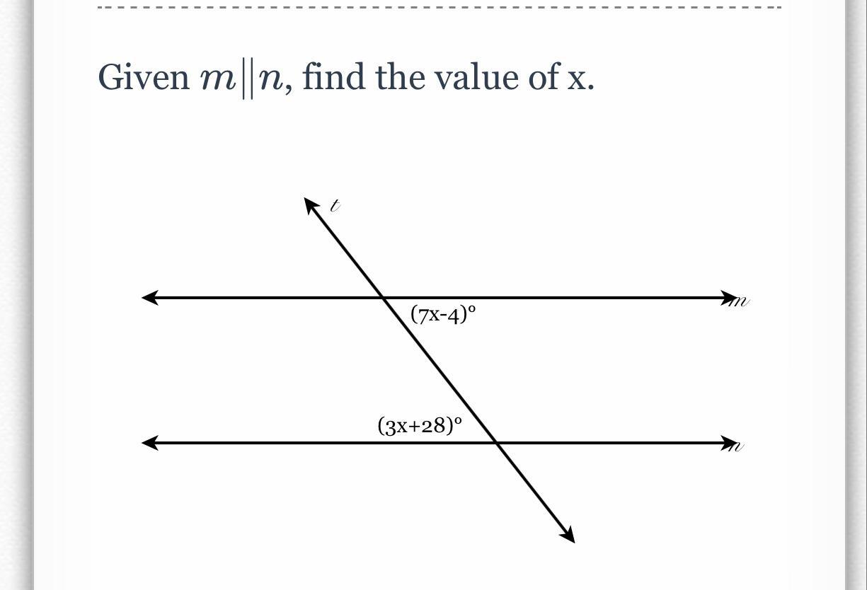 < (7x - 4)° and < (3x + 28)° are Alternate interior angles that do not have a common vertex on alternate sides of the transversal, <em>t</em>. Therefore, they have the same measure.