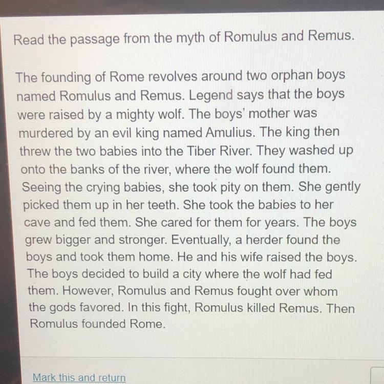 We've been over this in my class, at the bottom of your excerpt it says that the brothers decided to build a city because of where the she-wolf raised them. This tells us that the myth of Romulus and Remus is about why Rome was founded.