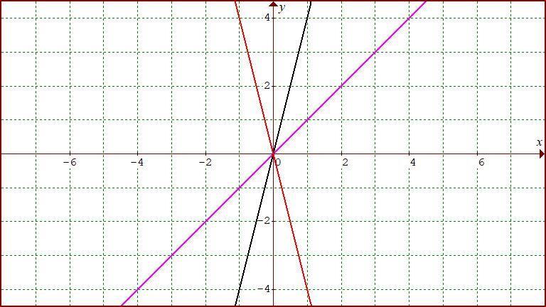 In the attached image, f(x) = x is purple, h(x) = 4x is black, g(x) = -4x is red.