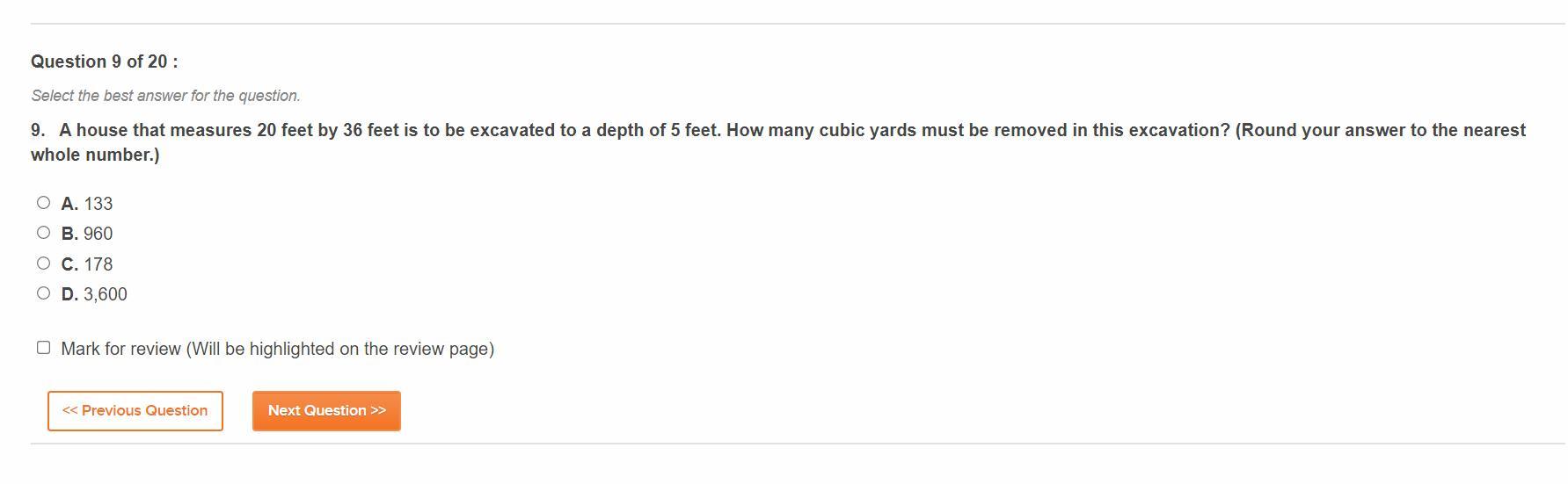 A house that measures 20 feet by 36 feet is to be excavated to a depth of 5 feet. How many cubic yards must be removed in this e