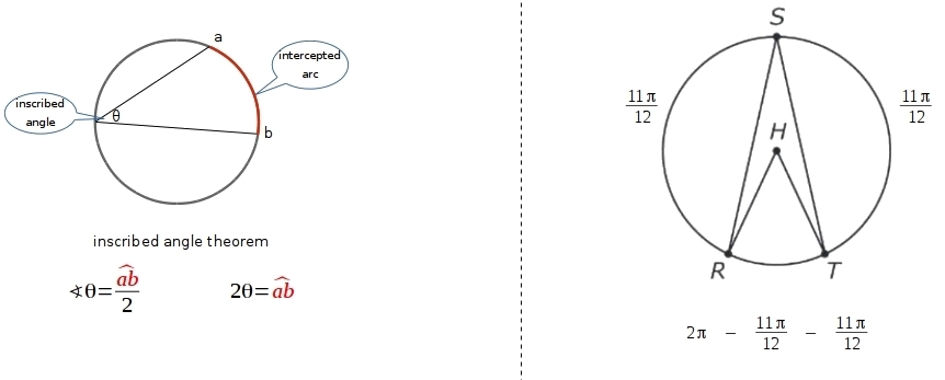 since the arcs of ST and RS are twins, and the circle has a total radians of 2π, then the arcRT is just 2π - arcST - arcRS.