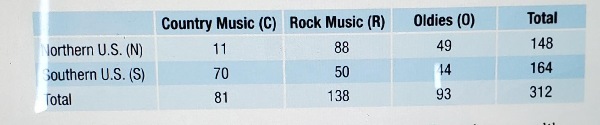 c) 0.27 = 27% probability that a randomly selected person from this from this group likes oldies given that they are from the South.