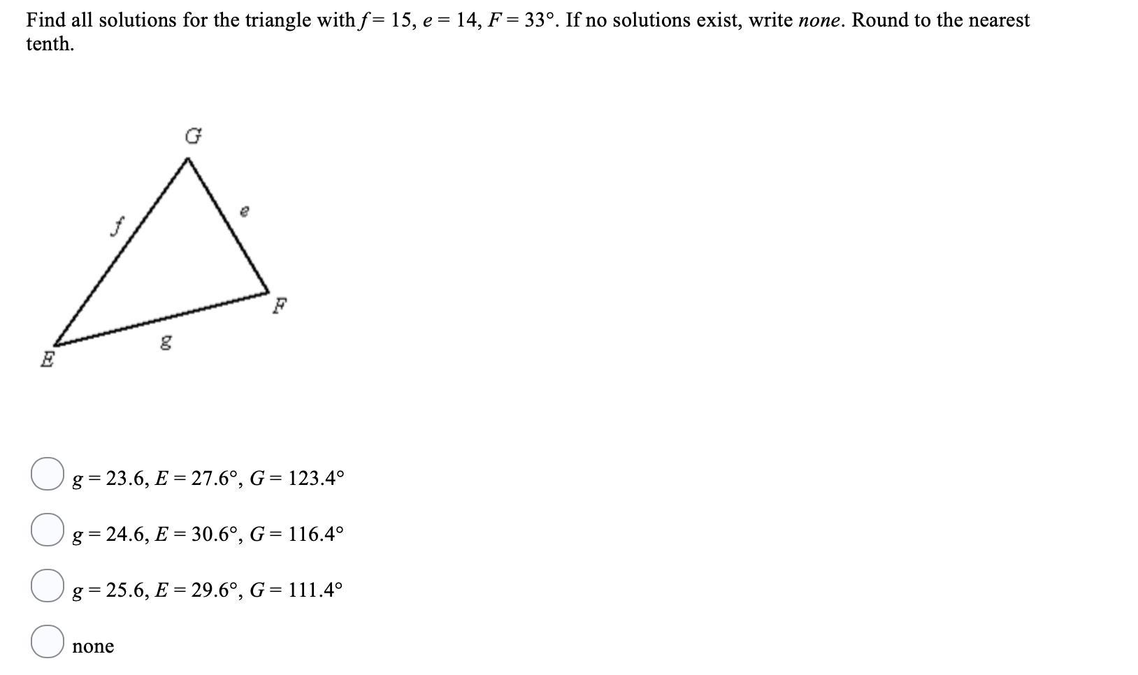 In this case, e/sin E = f/sin F = g/ sin G