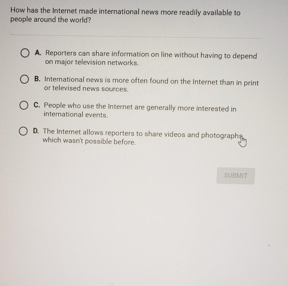 n share information on line without having to depend on major television networks, e, International news is more often found on the Internet than in print or televised news sources O C. People who use the Internet are generally more interested in international events, D. The memet allows reporters to share videos and photography, which wasn't possible ,