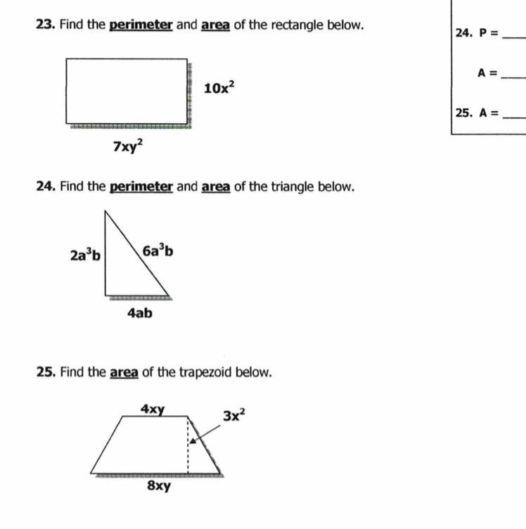 23. Perimeter is the sum of all four sides: 2(10x^2) + 2(7xy^2) = 20x^2 + 14xy^2 This can also be written as 2x(10x + 7y^2)