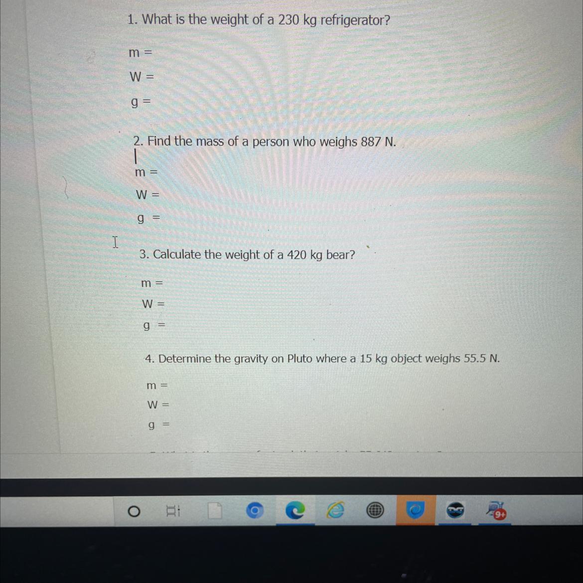 4. Determine the gravity on Pluto where a 15 kg object weighs 55.5N.