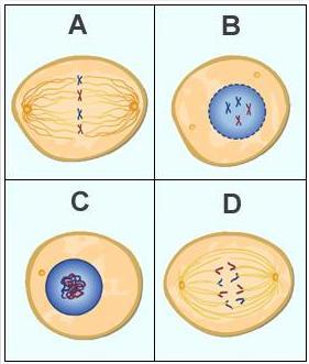Explanation: Image C shows the cell in interphase. The cell's DNA is in the form of chromatin. Image B shows the cell in prophase. The chromosomes have thickened and can be seen individually. Outside the nucleus, spindle fiber is beginning to form between the centrioles. Image A shows the cell in metaphase. The chromosomes have lined up along the equator of the cell and are attached to spindle fibers at their centromere. Image D shows the cell in anaphase. The individual chromatids have been drawn apart to opposite poles of the cell. This is just before the cell begins to split into two identical cells.