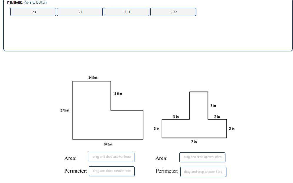 Left: area: 702 square feet; perimeter: 114 feet