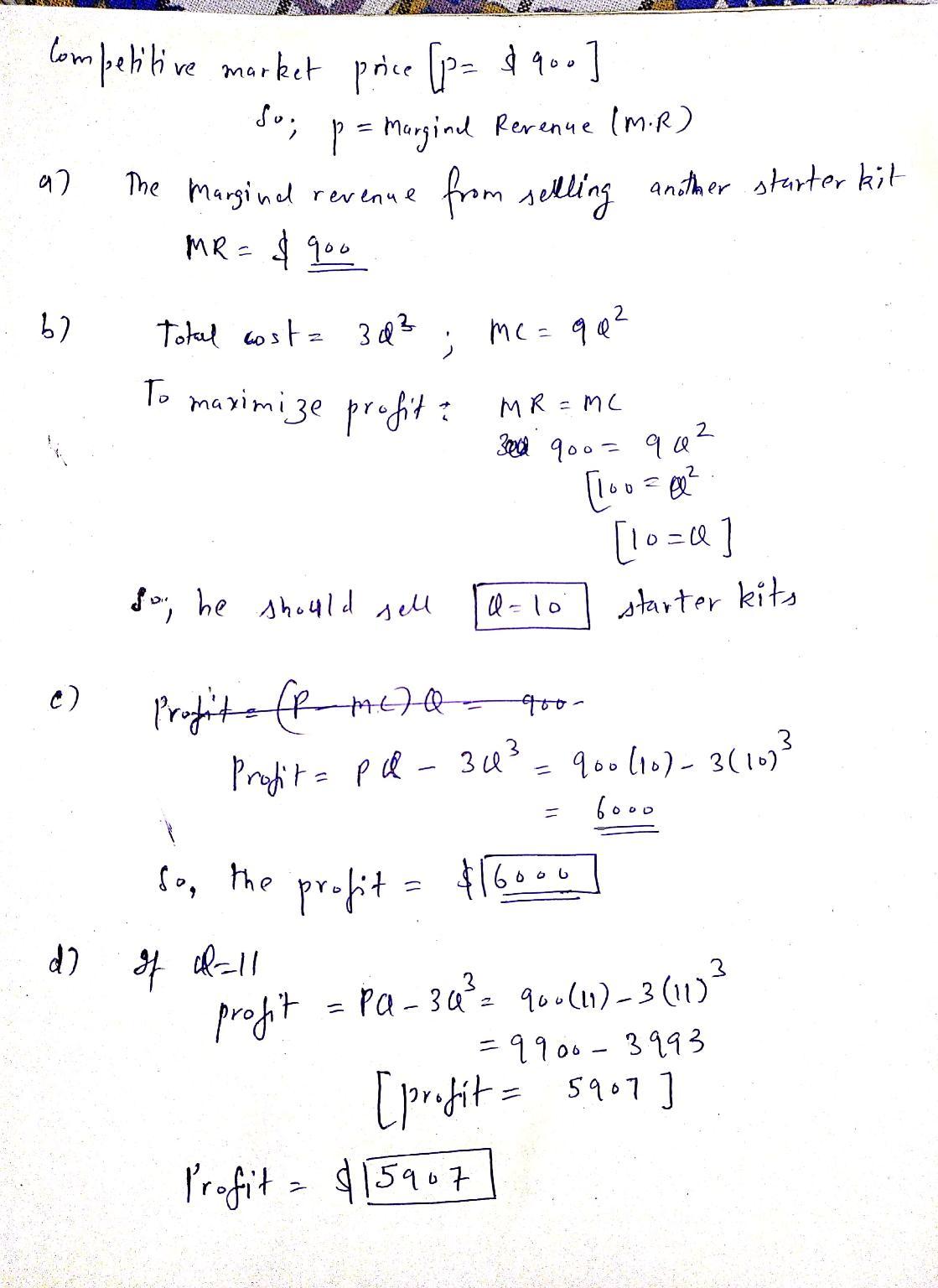 e. The marginal revenue of producing an additional starter kit will be revenue at Q =11 minus revenue at Q=10