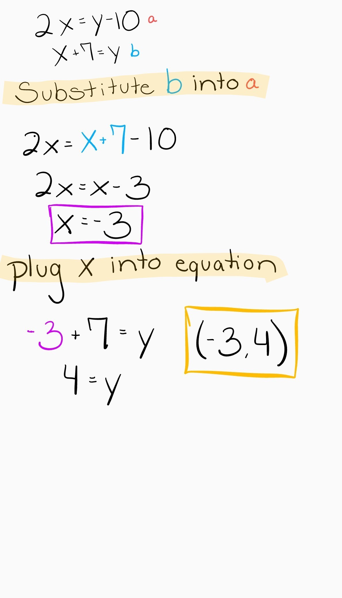 Solve the system of linear equations by substitution. 2x=y−10 x+7=y