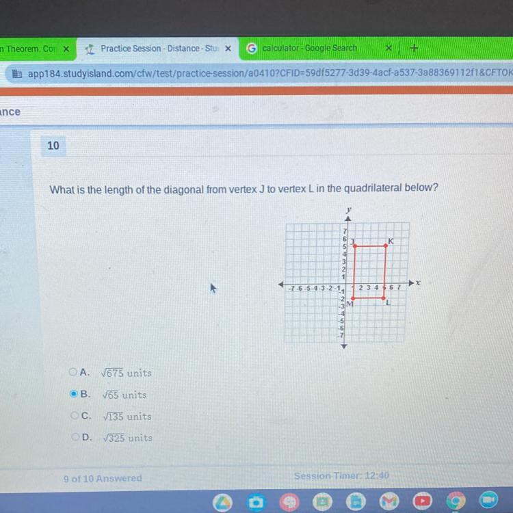 Step-by-step explanation: If we count the squares from J down to M and horizantally from M over to L, it is 7 by 4. Then we use the A squared plus B squared = C squared formula. What we get is 49 and 16. Add them together and we get 65. 65 is not a square root, so all we can get is root 65.