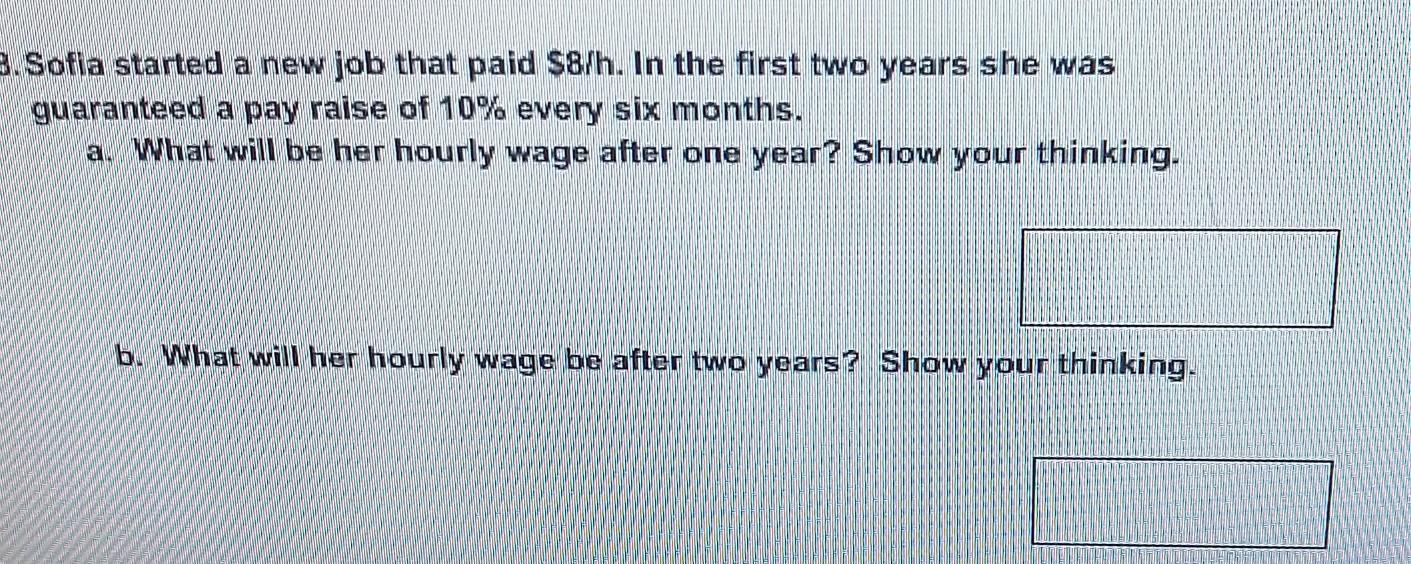 a. assuming her pay is raised 10% of her current salary instead of 10% of her <em>original</em> pay of $8 an hour,