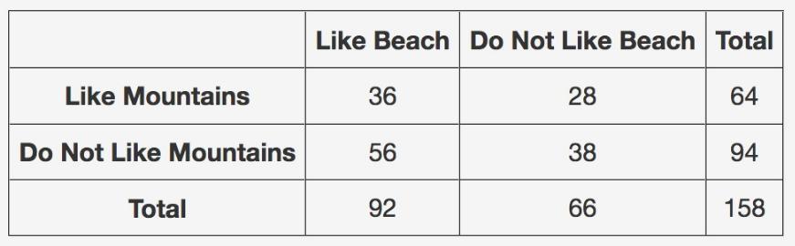 For the given case, from the table (image attached below), we can see that, there are total 94 students who do not like mountains. Now, out of those 94, there are 38 students not liking beach.