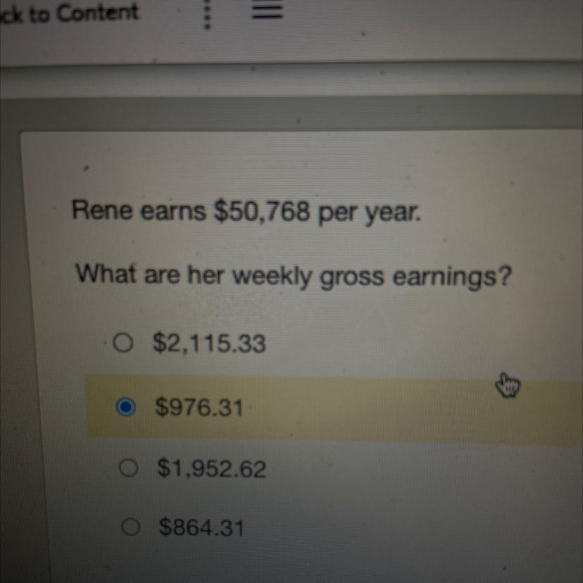Answer : Rena's weekly gross earnings are $976.31.
