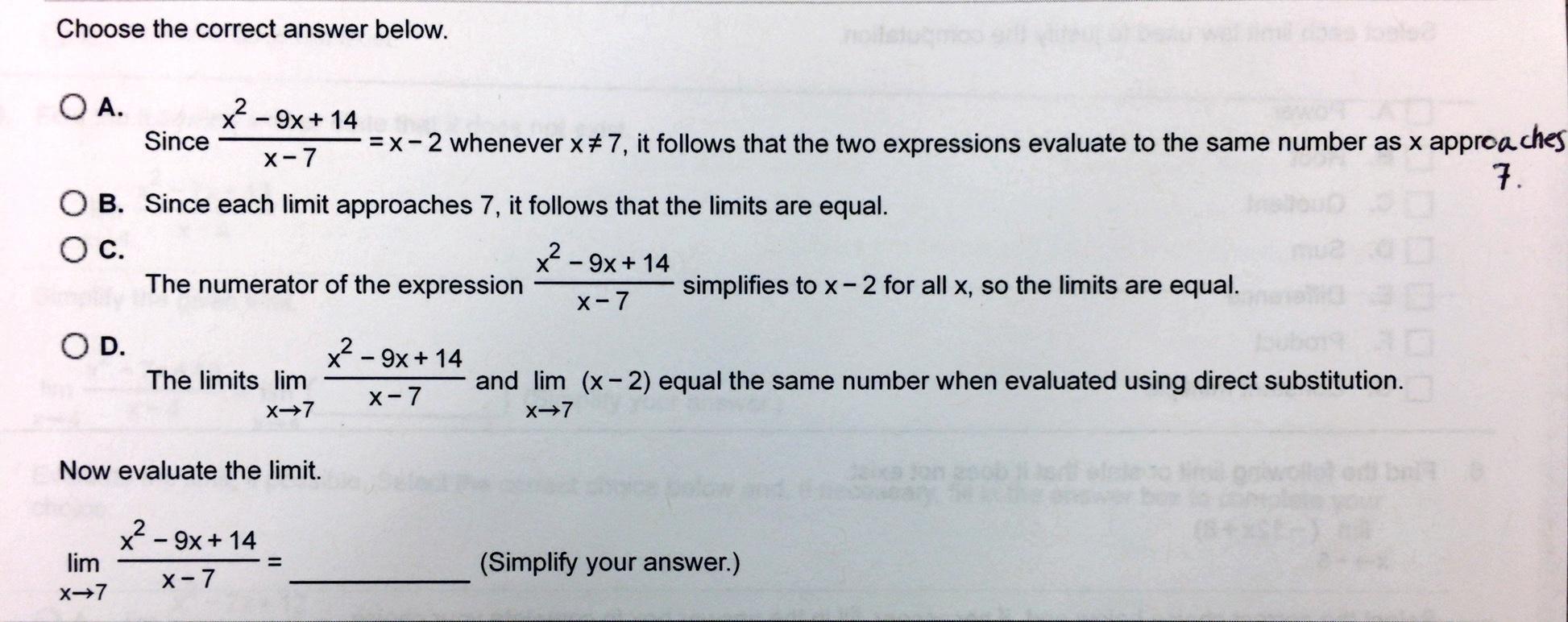 B. The limits Lim x-->7 (x²-9x+14)/x-7 and lim x--> 7 (x-2) equals the same number when evaluated using direct substitution. The limit of both functions is 5