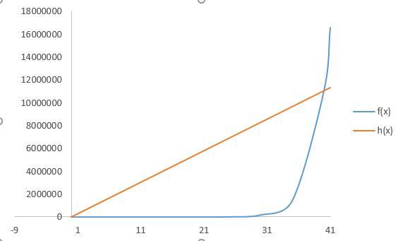 Function g(x) = 276434.283*x pass at points (0, 1) and (40, 11057332.32). h(x) = 276434.283*x + 2 fulfill the requirement that h(x) is greater than f(x), for all x such that 0 ≤ x ≤ 40, but f(41) > h(41), because at the next point, the exponential function will growths faster than linear function (see figure).