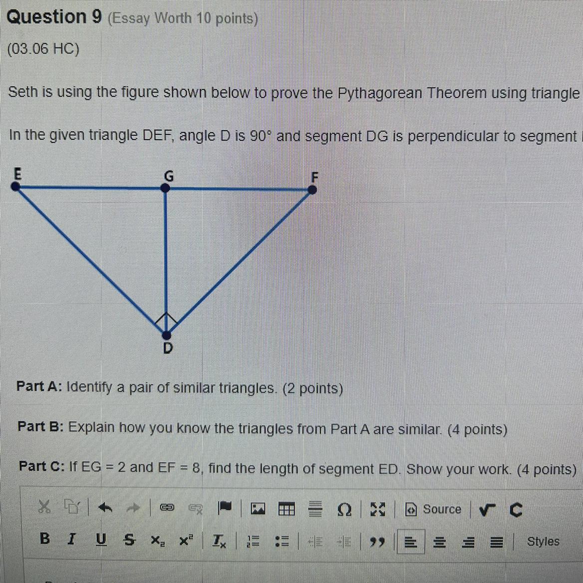 This means the ED, a leg of the right triangle, is the geometric mean of EF, the length of the hypotenuse (8) and the EG, the segment adjacent to the leg (2)