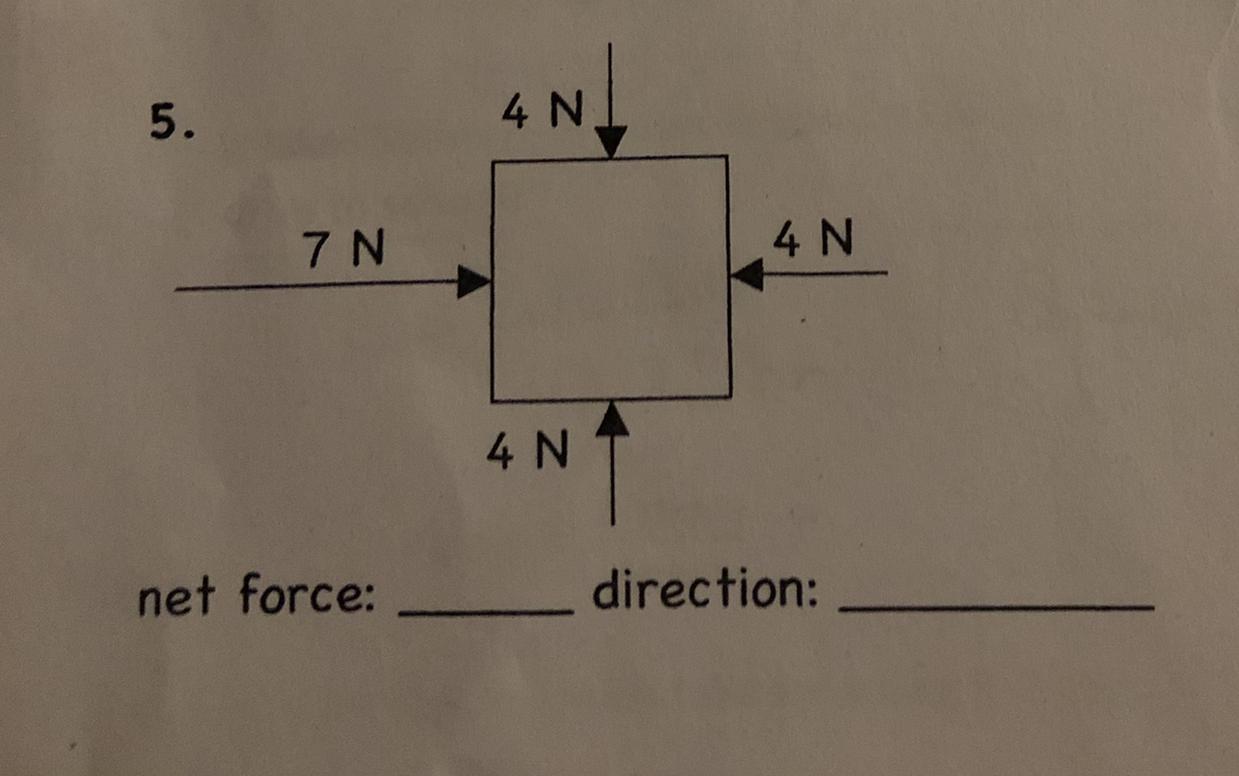 The forces pushing the box (cube? square?) from the top and the bottom cancel out, since they are both 4N. Then, if you subtract the 4N pushing from the right from the 7N pushing from the left, you get 3N. SInce it is pushing from the left, the object would move to the right,