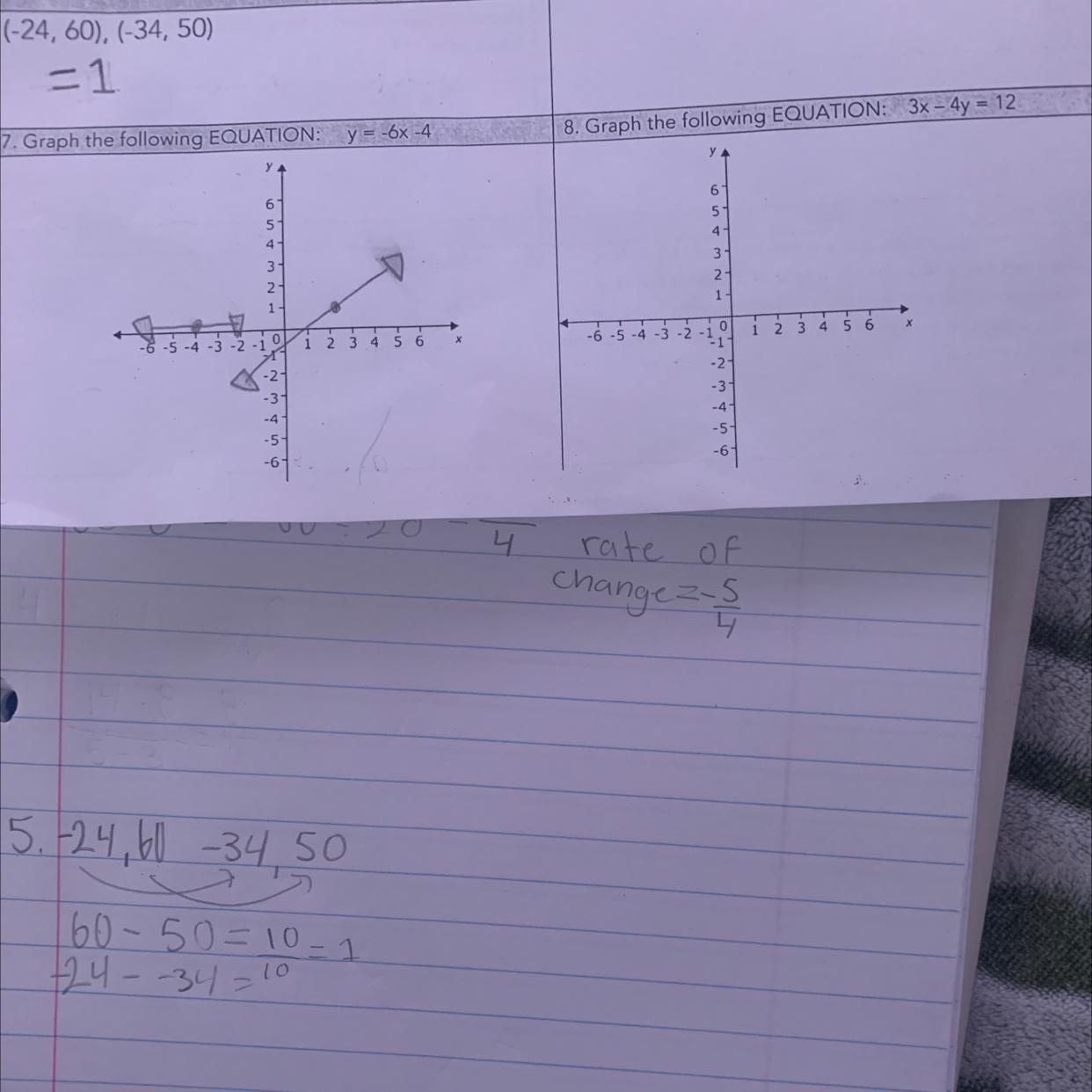 Similar to how we graphed the equation from question 7, start by plotting the y-intercept, (0, -3). Then, use the slope of the equation, <em>m</em> = ¾ (3 units rise, 4 units run) to plot the next point. The next point should occur at (0, 4).