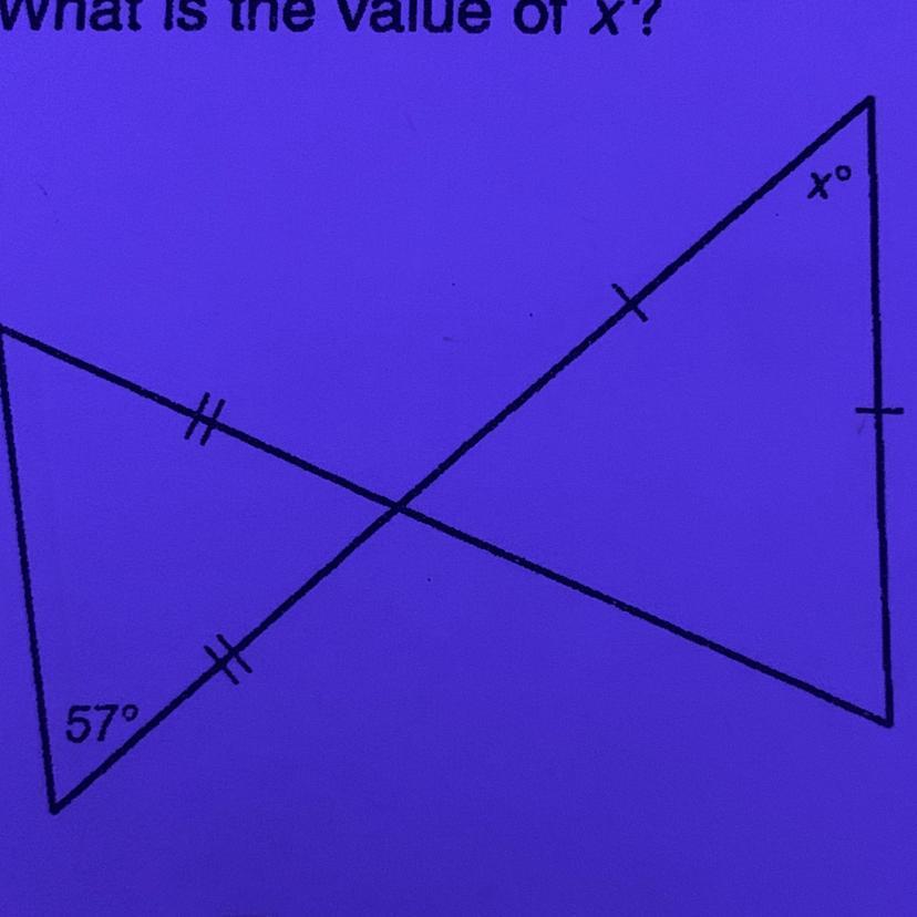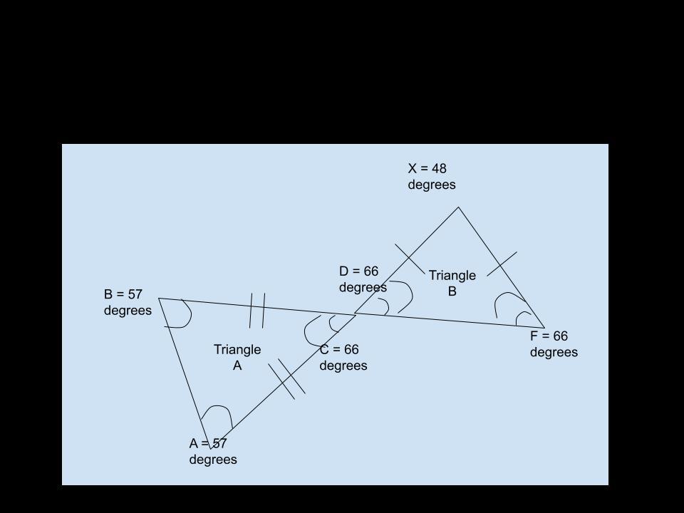 As you can see. Triangle A, as it is shown in the bad drawing. It is an isosceles triangle because two sides are equal to one another, indicated with the lines. Angle A is given as 57. By the isosceles triangle theorem, Angle A equals to Angle B. Calculating the missing angle: 180 - 57 (given) - 57 (because of the isosceles triangle theorem type of thing. I forgot) = 66