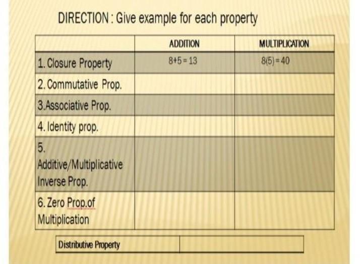 Addition 6) The additive property of zero states that when you have any number and add zero to it, your answer will always equal the original number. In our reading example, you took 40 and added 0. When you did this, you got 40, the original number.
